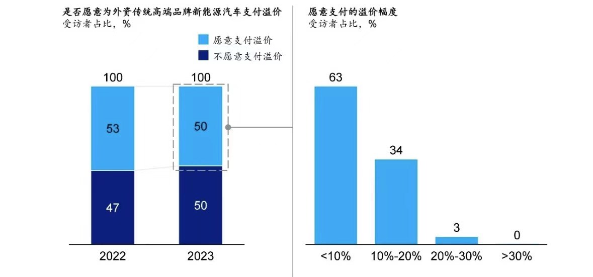 在《2024麥肯錫中國汽車消費(fèi)者洞察》中顯示,50%的受訪者不愿意為外資品牌支付溢價,相比于無形的品牌力,消費(fèi)者現(xiàn)在更愛實(shí)在的技術(shù)與配置。