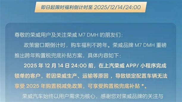而最新一輪的政策兜底中還分成2種,一是以12月15日左右為截止日期的,還有一種是真的以12月31日為鎖單截止日期的。前者,就比如最新的榮威M7 DMH,其鎖單截止日期為12月14日24:00。本質(zhì)上,這相當(dāng)于車企在兜底的過程中,在盡量保護自己。換句話說就是,風(fēng)險最小化,或者是性價比最大化。